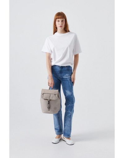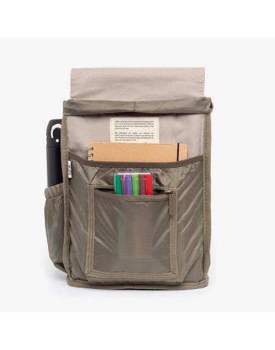 El tejido de la mochila es ecológico, impermeable y de alto rendimiento. Está hecho con botellas de plástico recicladas.