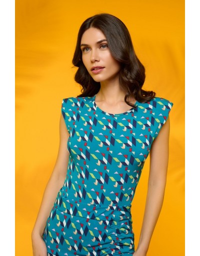 ¡Añade un toque audaz a tu outfit!  Nuestro body elástico con pequeñas hombreras es justo lo que necesitas para destacar con estilo y confianza. Con su estampado geométrico en colores vibrantes como rojo, blanco, amarillo y azul, este top no pasará desapercibido. Ideal para ti que buscas una prenda original, cómoda y divertida.
