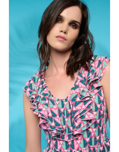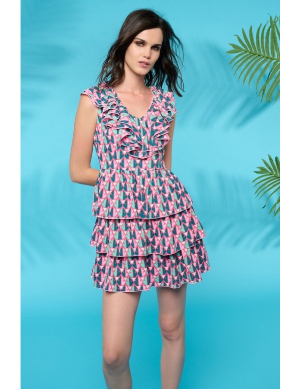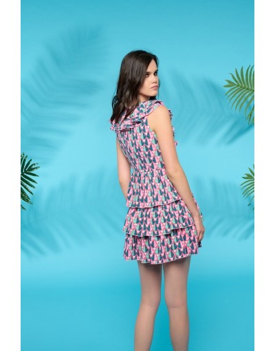 Destaca con nuestro vestido sin mangas y volantes, con un alegre estampado con hojas geométrico en tonos rosas, azules y blancos. Con un escote en V y una falda con volantes, este vestido es ideal para un look fresco, juvenil y divertido.