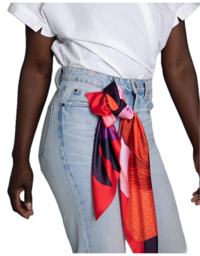 Pañuelo cuadrado mediano súper suave y con un tejido de poliéster reciclado que recuerda a la seda. Tiene el dibujo en un solo lado y unos colores vivos que iluminan cualquier look.