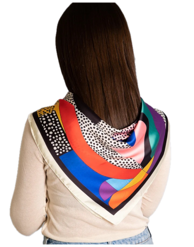 Pañuelo cuadrado mediano súper suave y con un tejido de poliéster reciclado que recuerda a la seda. Tiene el dibujo en un solo lado y unos colores vivos que iluminan cualquier look.