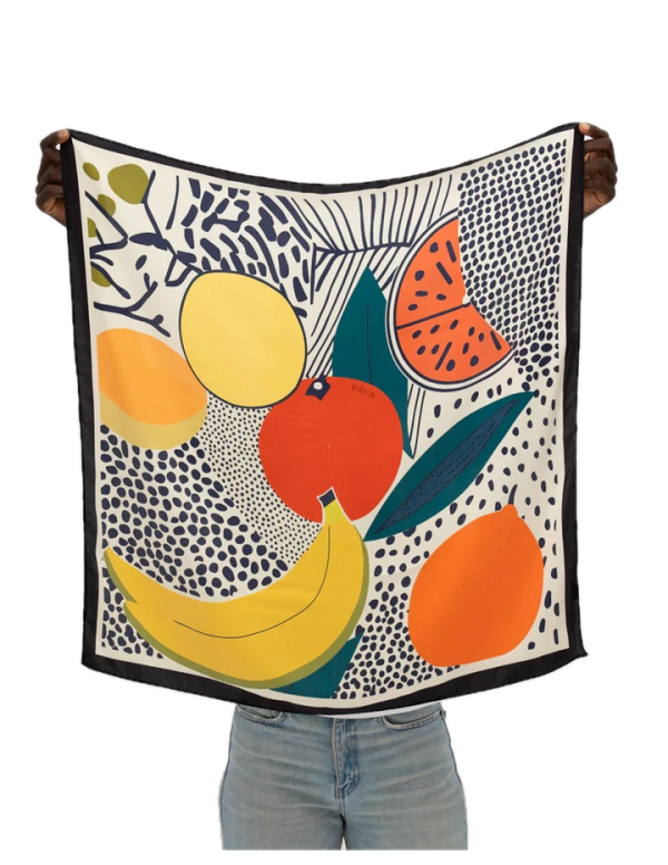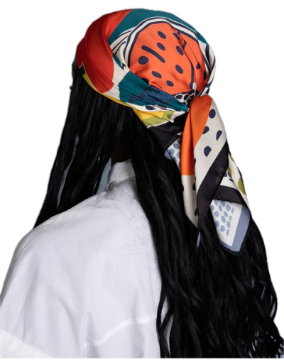 Pañuelo cuadrado mediano súper suave y con un tejido de poliéster reciclado que recuerda a la seda. Tiene el dibujo en un solo lado y unos colores vivos que iluminan cualquier look.