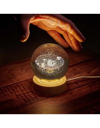 Esta pequeña lámpara combinan una elegante esfera de cristal con una base de madera. La esfera tiene un motivo grabado en 3D de Saturno.