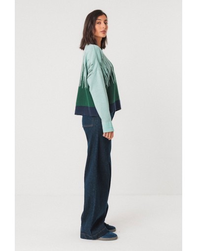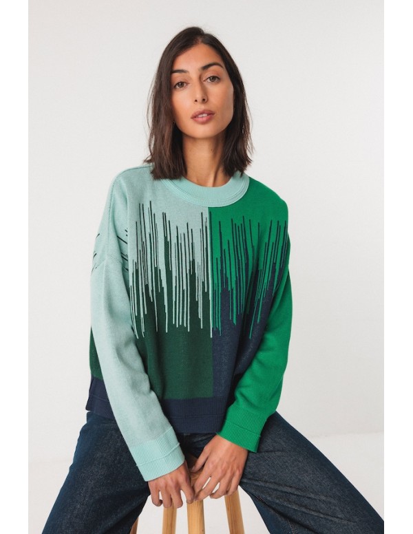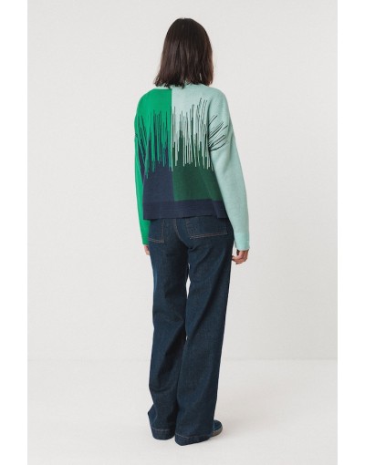 Suéter corto de punto jacquard semigrueso. Es de manga larga, tiene el cuello redondo y lleva remates de canalé en el cuello, la cintura y los puños.