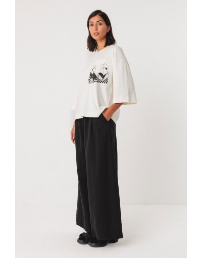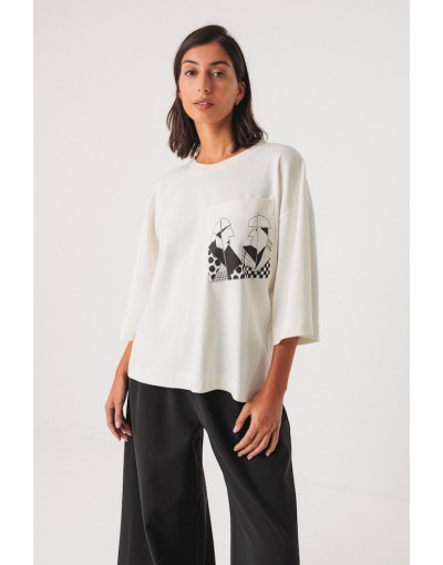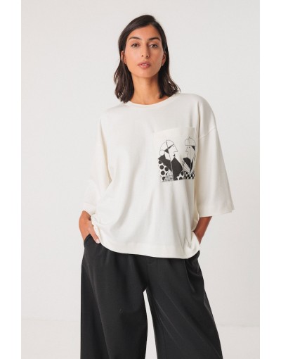Camiseta amplia de cuello redondo adornada con un bolsillo en el pecho. Las mangas llegan por debajo del codo.