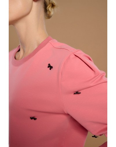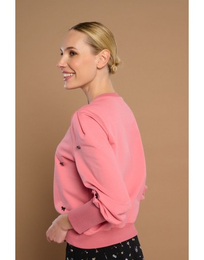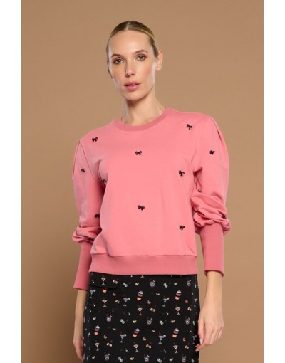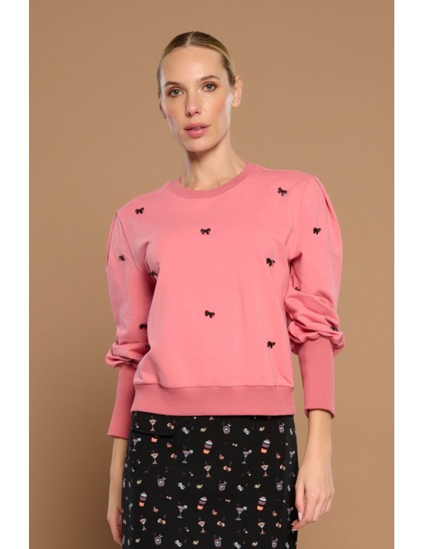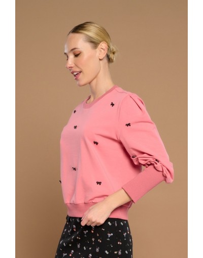 Esta sudadera de cuello redondo y manga larga combina sencillez con un detalle encantador: un pin decorativo con lazos cosidos que aporta un toque femenino y original.
