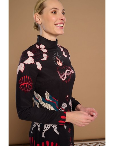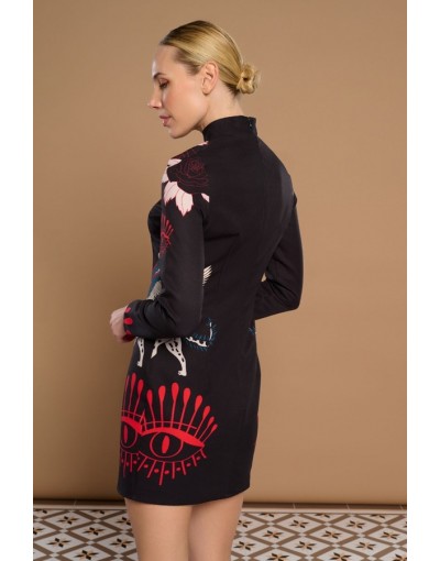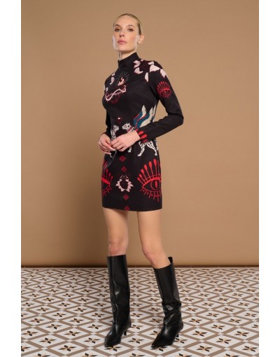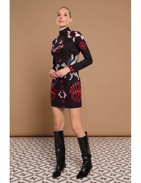 Vestido de cuello perkins y manga larga. Estampado místico. Forro interior. Cierre con cremallera oculta en costura. La modelo mide 1,77 m y lleva la talla S.