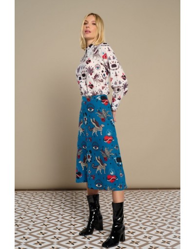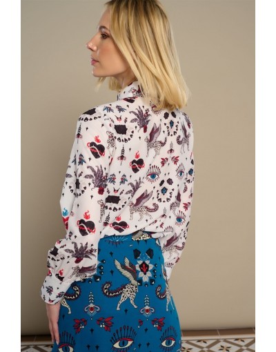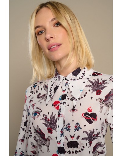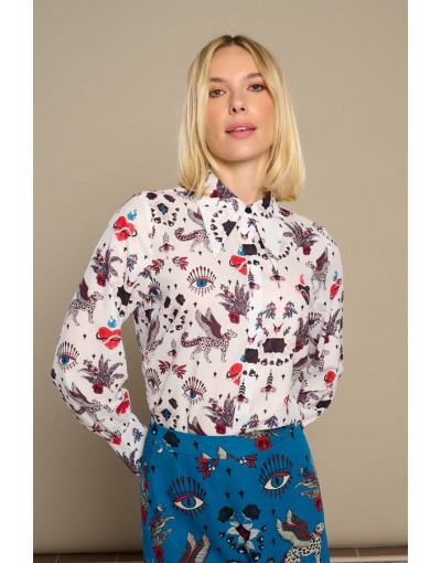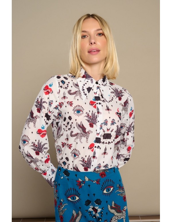 Esta camisa blanca de manga larga es una explosión de creatividad. El estampado multicolor incluye ojos, aves, flores y formas abstractas en tonos rojos, azules y negros, creando una pieza única que combina arte y moda. Su diseño llamativo la convierte en el centro de cualquier look, ideal para combinar con prendas lisas o para crear conjuntos coordinados con estampados similares.