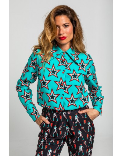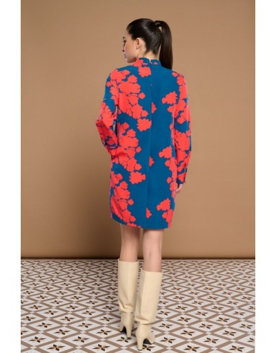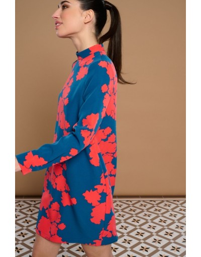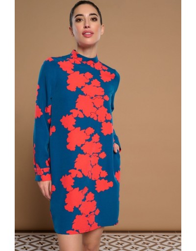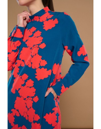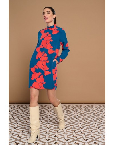 Este vestido de silueta elegante y mangas largas destaca por su vibrante estampado floral en rojo sobre fondo azul. El cuello Perkins aporta un aire sofisticado, mientras que el corte fluido y los materiales suaves aseguran comodidad durante todo el día.