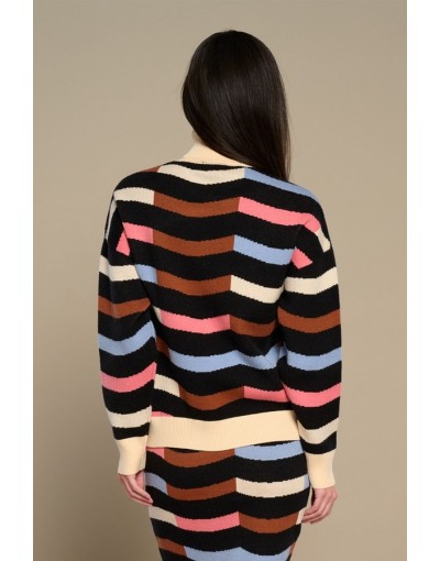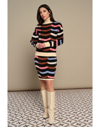 Este jersey lo tiene todo: cuello alto, manga larga y una actitud que no pasa desapercibida. Las ondas en negro, blanco, marrón, rosa y azul crean un efecto visual vibrante, casi hipnótico. La mezcla de viscosa, poliéster y nailon le da ese tacto suave y estructurado que se adapta al cuerpo sin apretar. Ideal para combinar con básicos y dejar que el estampado hable por ti.