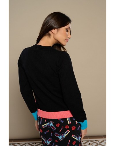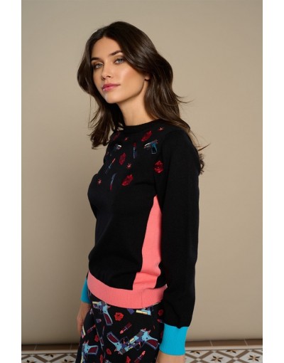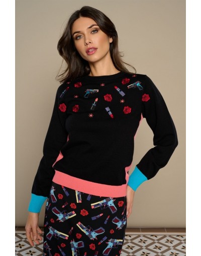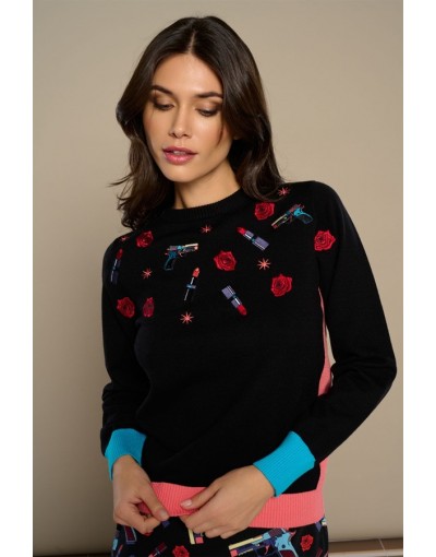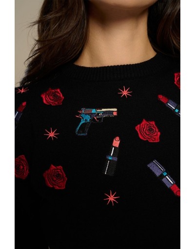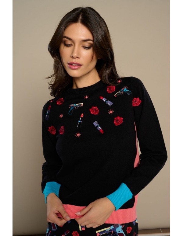 El jersey negro se adorna con bordados: rosas rojas, pintalabios y pequeñas pistolas, creando un contraste audaz entre lo romántico y lo rebelde. Los puños azul eléctrico y la cintura rosa añaden un toque pop inesperado. El pantalón, a juego, repite el patrón con la misma energía provocadora. Para quienes entienden la moda como una forma de expresión sin filtros.