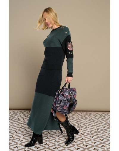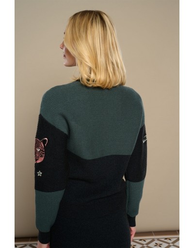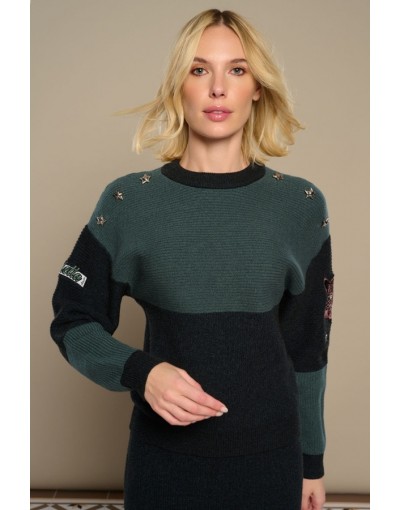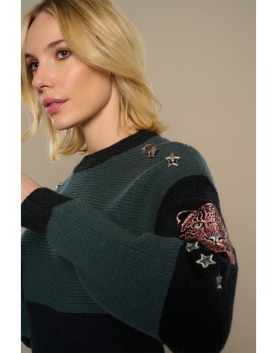 Este no es un jersey cualquiera. Su diseño en bloques de color negro y verde oscuro crea una base elegante y moderna, pero son los detalles los que lo convierten en una prenda realmente especial. Las estrellas metálicas en los hombros aportan un toque galáctico y atrevido, mientras que el bordado del leopardo en la manga derecha añade fuerza y carácter, como un guiño a tu lado más salvaje. Confeccionado en punto suave y resistente, tiene un cuello redondo clásico que equilibra el conjunto y lo hace fácil de combinar. Es perfecto para quienes buscan salirse del típico look sin perder sofisticación. Llévalo con jeans, pantalones de cuero o incluso una falda midi: este jersey se adapta, pero nunca pasa desapercibido.