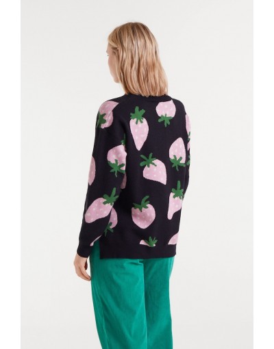 Jersey de punto jacquard con estampado Morango. Con cuello redondo y manga larga con hombro ligeramente caído. Detalles con acabados en rib. La modelo mide 174 cm y lleva la talla S.