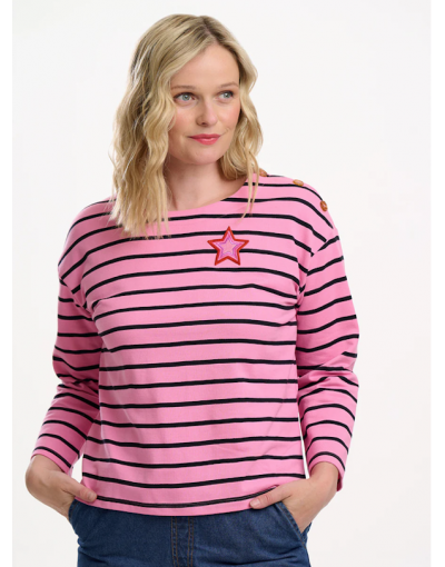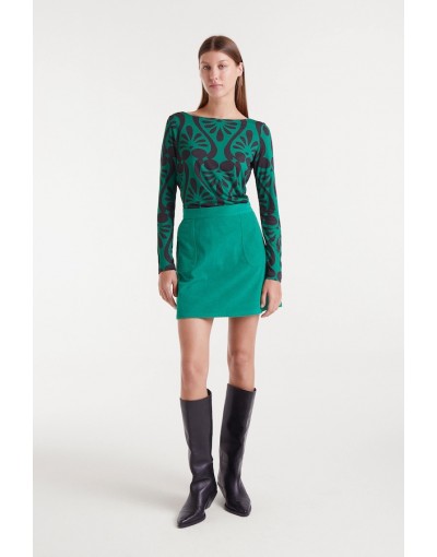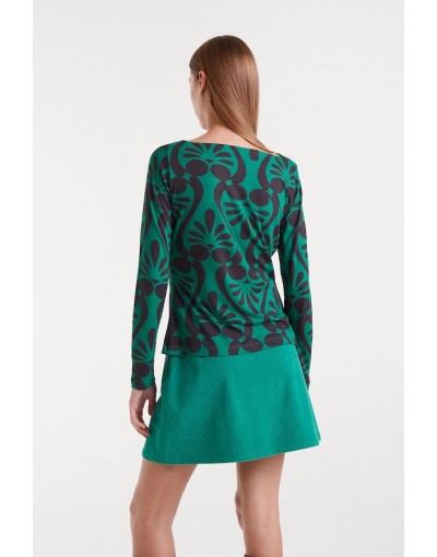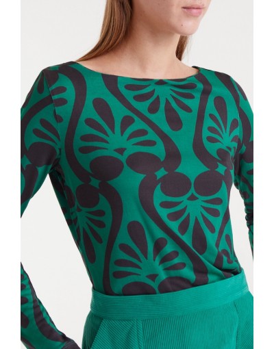 Camiseta de color verde con estampado Baroque. Con escote barco y manga larga. La modelo mide 177 cm y lleva la talla S.