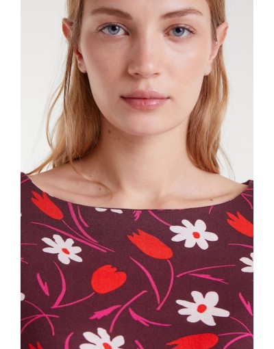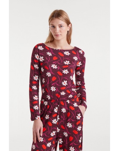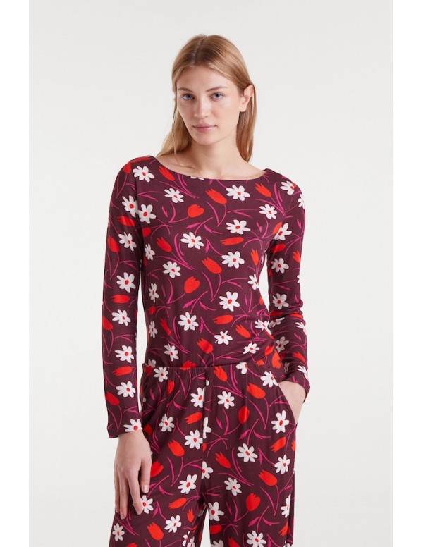 Camiseta con tejido estampado Tulip. Con cuello barco y manga larga. La modelo mide 179 cm y lleva la talla S.