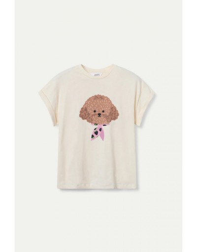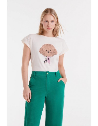 Camiseta con tejido 100% algodón de color blanco con estampado de caniche. Cuello redondo y manga corta con vuelta. Hombro ligeramente caído. La modelo mide 179 cm y lleva la talla S.