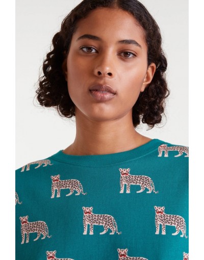 Sudadera de tejido 100% algodón c on estampado Onca. Cuello redondo y manga larga. Bajo asimétrico con aberturas laterales. Detalles en rib. La modelo mide 175 cm y lleva la talla S.