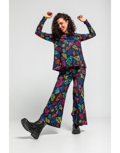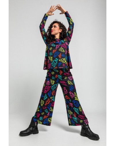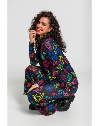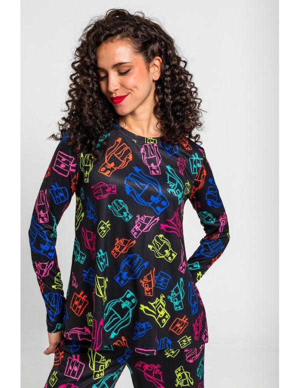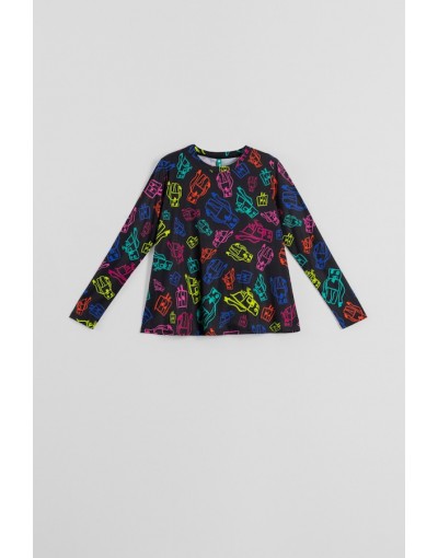 We are connected: porque todos ellos, juntos se recargan las baterías. Este robotito es obra de uno de los maravillosos niños del centro de acogida de Granada al que irán destinados parte de los beneficios de esta colección. - Camiseta Corte A: Camiseta elástica de estampado vectorial con corte acampanado, manga larga y cuello redondo con posicional de la colección. - 95% Poliéster y 5% Elastán.
