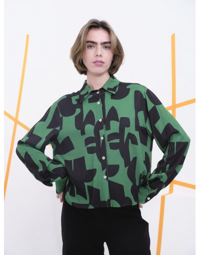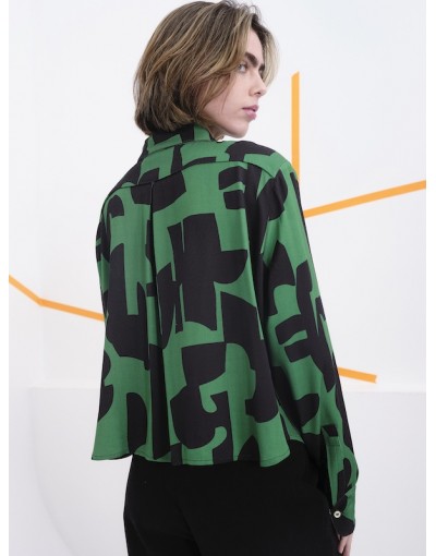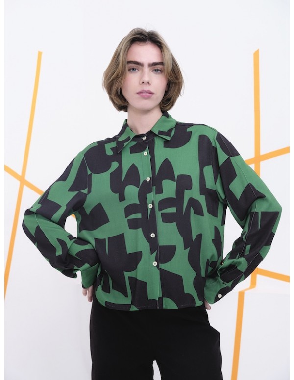 Camisa de manga larga con estampado abstracto en contraste. Largo de la camisa a cintura baja. Confeccionada en un tejido ligero de caída fluida, presenta cuello camisero clásico, cierre frontal con botones y puños abotonados. Su diseño contemporáneo y versátil la convierte en una prenda ideal para elevar looks tanto casuales como más sofisticados