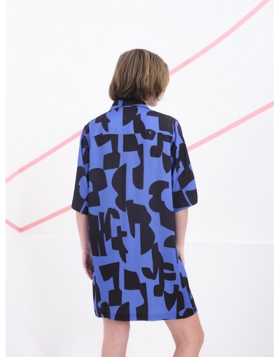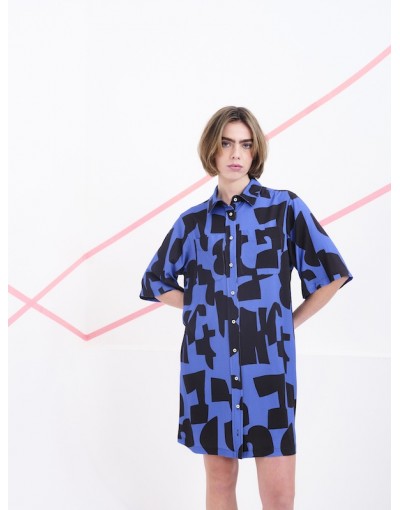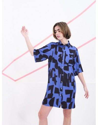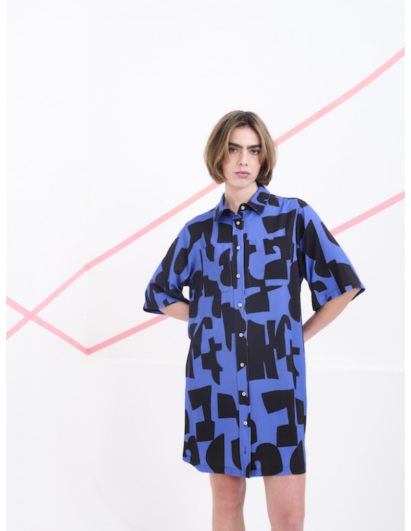 Este vestido camisero de manga corta es una declaración de estilo gráfico y contemporáneo. Confeccionado en una viscosa, se adorna con un estampado negro de formas abstractas que evocan trazos artísticos y espontáneos. Su corte recto y relajado, junto con el cierre frontal de botones, lo convierte en una prenda versátil y cómoda, ideal para llevar tanto en looks informales como en propuestas más creativas.Las mangas caen justo por encima del codo, aportando equilibrio al diseño, mientras que el tejido ligero permite libertad de movimiento. Una pieza pensada para quienes buscan vestir con personalidad y originalidad sin renunciar a la funcionalidad.