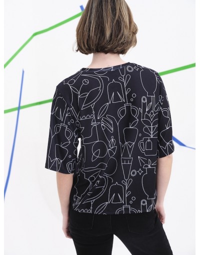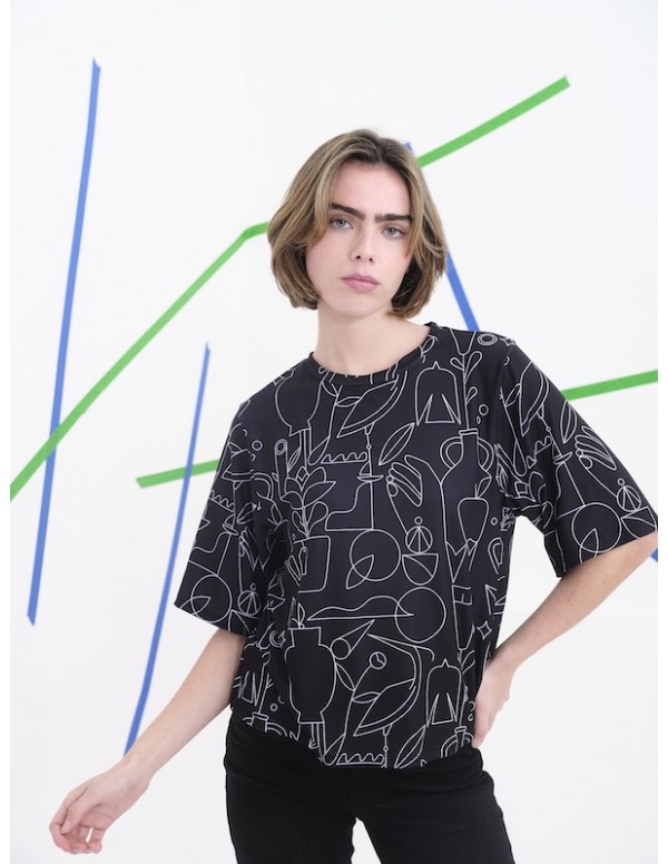 Esta camisa de manga corta destaca por su diseño gráfico y contemporáneo, protagonizado por un estampado creado por la artista Judit Canela. La superficie se recorre con líneas fluidas que dibujan figuras estilizadas, rostros, animales y elementos vegetales, generando una narrativa visual rica y expresiva.Su corte cómodo y estructurado la convierte en una prenda versátil, ideal para llevar como pieza protagonista o integrada en estilismos más sobrios. Una propuesta pensada para quienes visten con sensibilidad artística y gusto por lo singular.