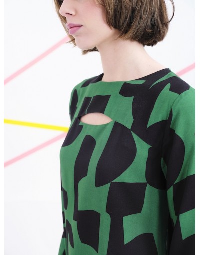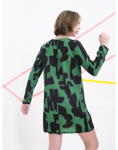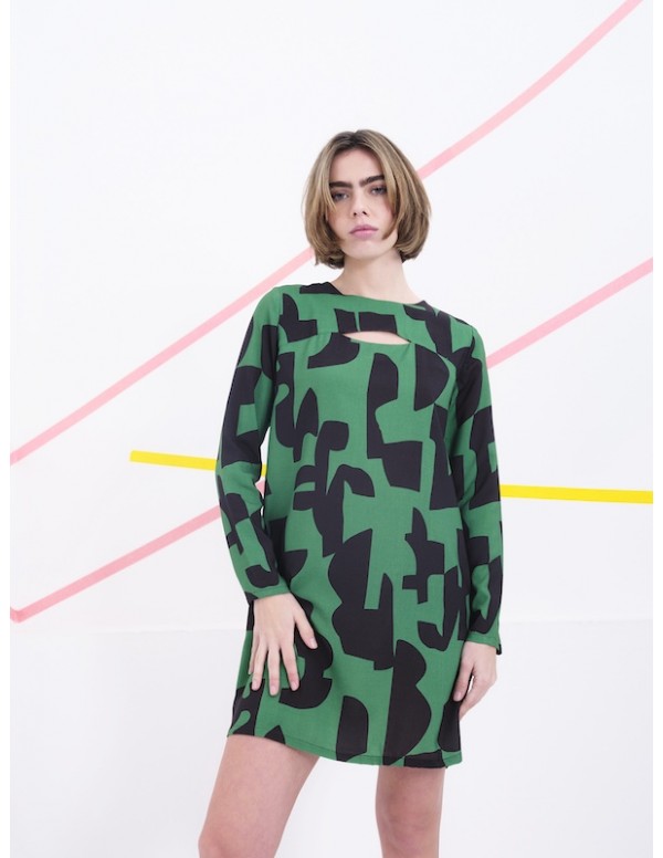Este vestido corto de manga larga es una pieza gráfica y contemporánea que combina estructura con expresión visual. Confeccionado en un vibrante tono verde, se adorna con un estampado negro de formas abstractas que aportan dinamismo y personalidad. El diseño incluye un cut-out rectangular en el escote, que rompe con la silueta clásica y añade un toque audaz y moderno. Su largo mini y corte recto permiten libertad de movimiento, mientras que el tejido ligero lo convierte en una opción versátil para el día o la noche. Una prenda pensada para quienes buscan vestir con identidad, fuerza y sensibilidad artística.