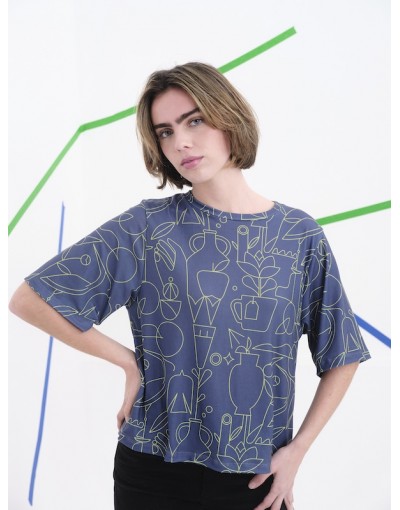 Un top que no pasa desapercibido. El diseño abstracto en negro, rojo, azul y blanco sobre fondo claro crea un contraste vibrante y moderno. El...