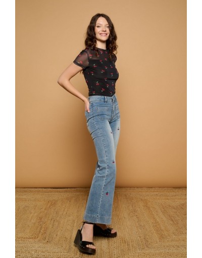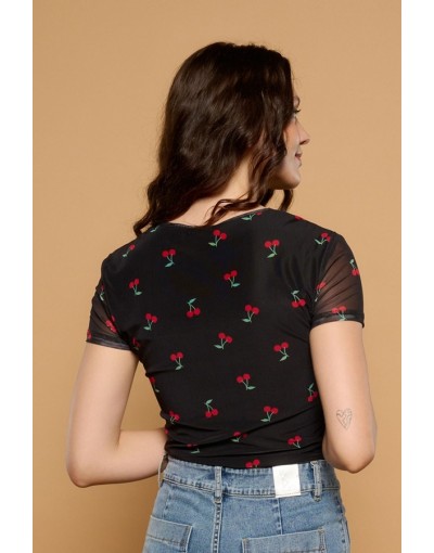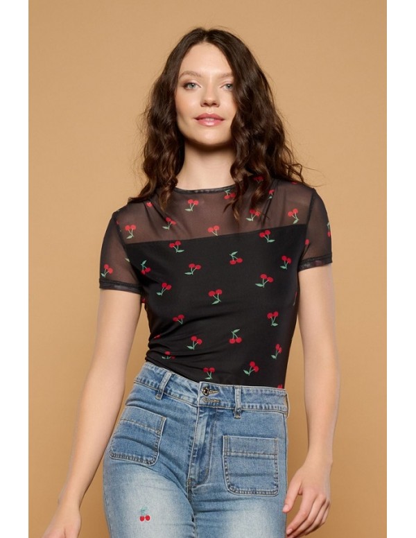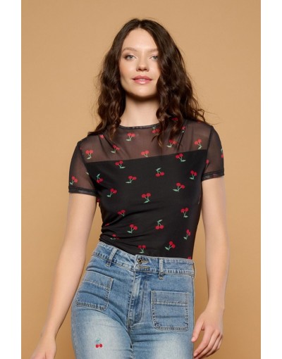 Top Manga Corta de Tul con Forro y Estampado Cerezas Cherry Minueto