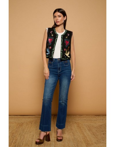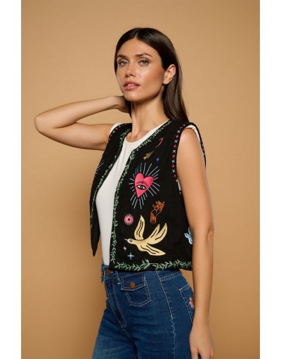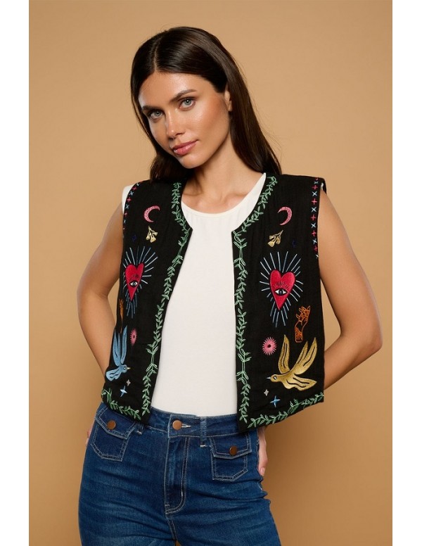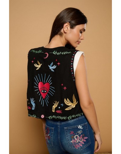 Chaleco de cuello redondo. Diseño abierto. Bordados de inspiración mística que incluyen corazones con ojos, aves y motivos celestiales. Ribete de hojas verdes bordadas en contorno. Tejido mezcla de viscosa y lino.