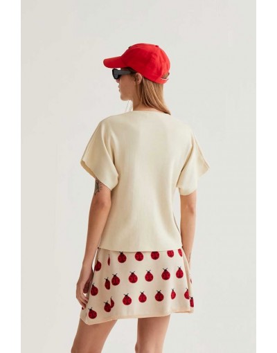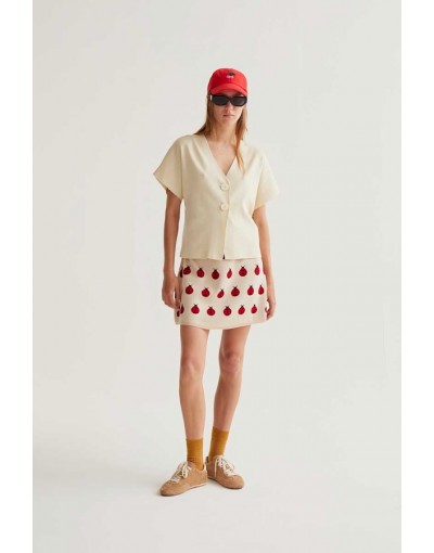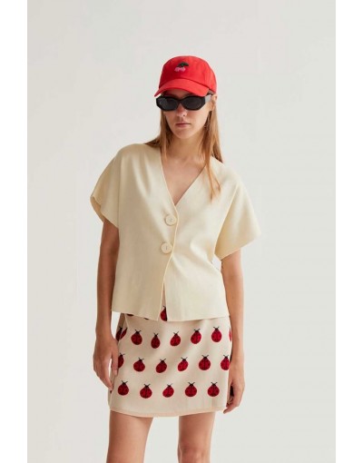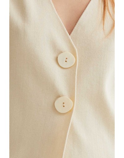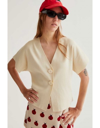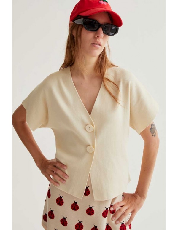 Cárdigan con tejido punto de color blanco roto. Escote pico y manga corta. Hombros caídos. Cierre frontal con botones grandes.