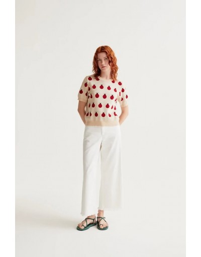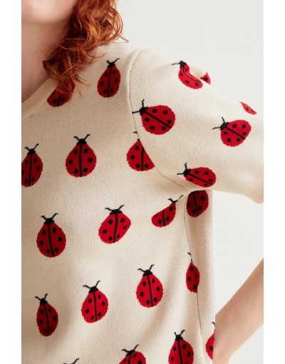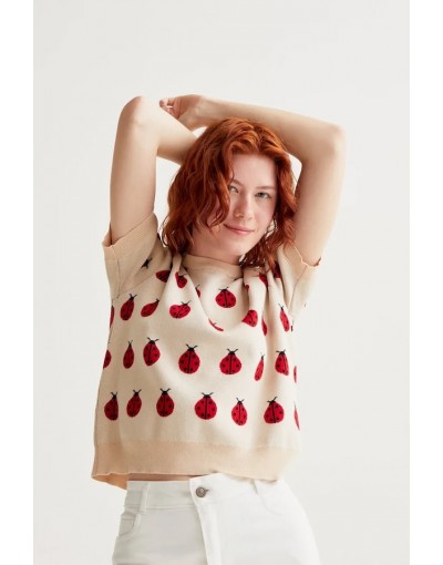 Jersey de tejido punto con estampado red coccinella. Cuello redondo y manga corta ligeramente abullonada. Detalles acabados en rib. La modelo mide 175 cm y lleva la talla S.