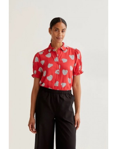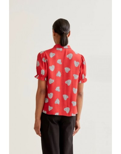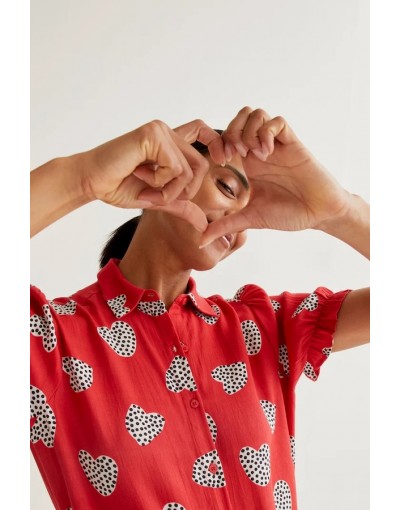 Camisa con estampado harmony red. Cuello con solapa y manga corta ligeramente abullonada con detalle de volantes. Cierre frontal con botones de color rojo. La modelo mide 173 cm y lleva la talla S.