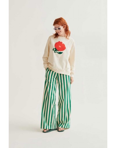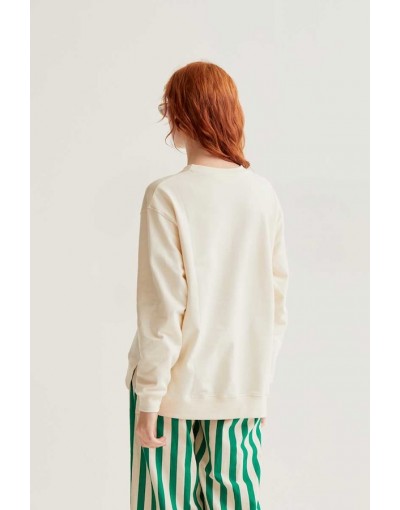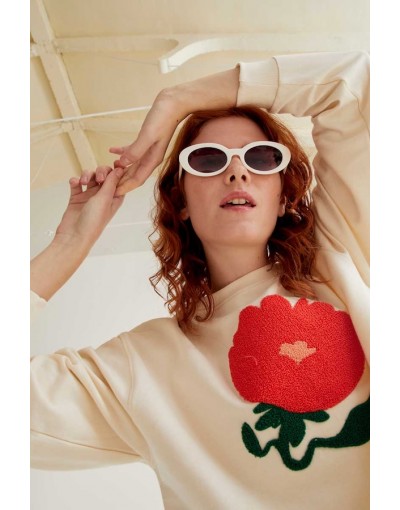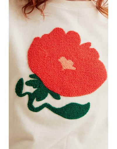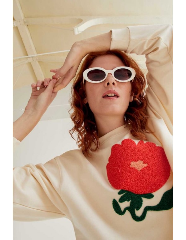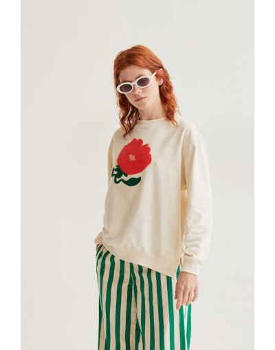 Sudadera con tejido 100% algodón de color blanco roto con bordado de flor gigante de color rojo. Cuello redondo y manga larga. Hombro ligeramente caído. Detalles acabados en rib. La modelo mide 175 cm y lleva la talla S.