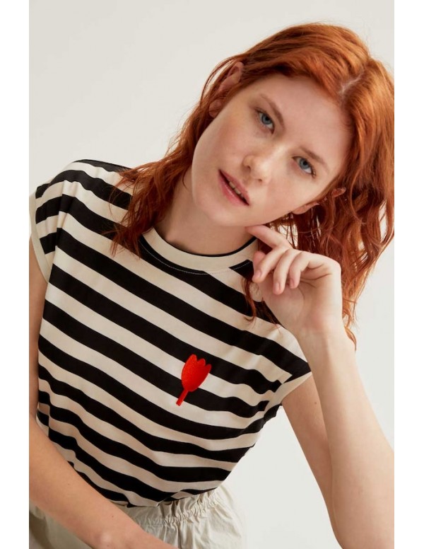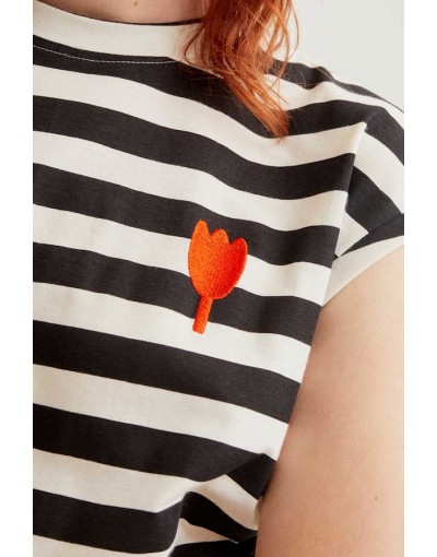 Camiseta de tejido 100% algodón con estampado de rayas blanco y negro. Cuello redondo y manga corta. Detalle bordado de tulipán. La modelo mide 177 cm y lleva la talla S.
