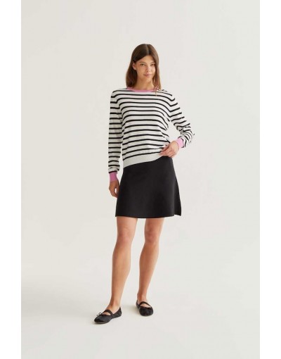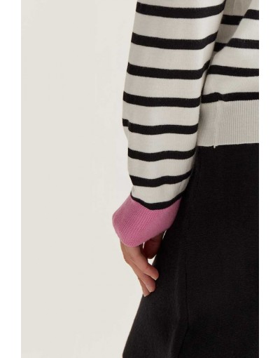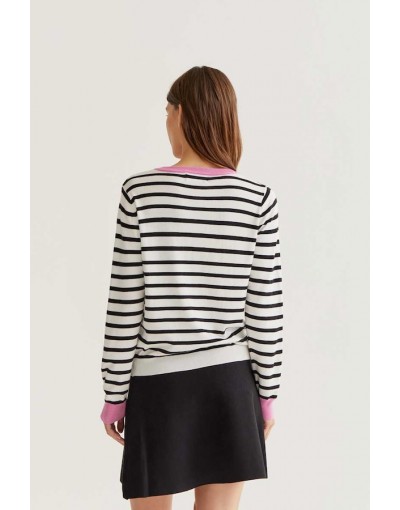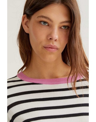 Jersey con tejido de punto estampado de rayas de color blanco y negro. Cuello redondo y manga larga con detalles en color rosa. Acabados en rib. La modelo mide 177 cm y lleva la talla S.