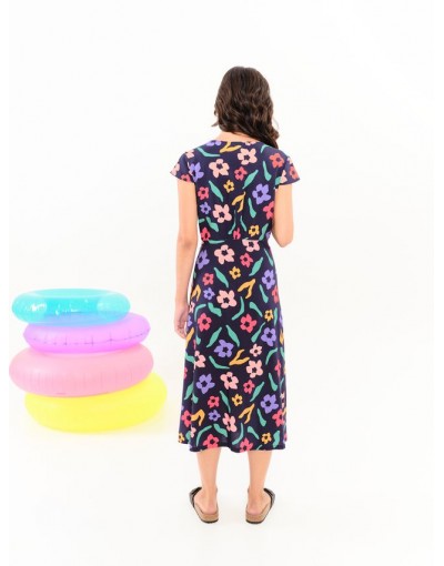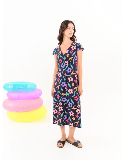 Vestido midi con escote en V y cierre con botones. Corte bajo pecho con fruncido . La modelo lleva la talla S